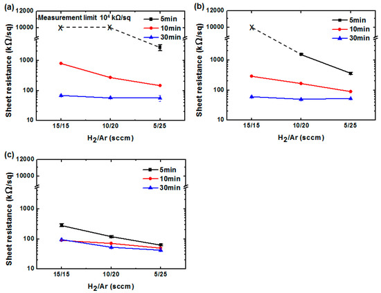 Reduced graphene oxide (rGO) sheet resistance for various treatment times and H2/Ar ratios at RF powers of: (a) 200; (b) 300; and (c) 400 W. (GO sheet resistance is unmeasurable).