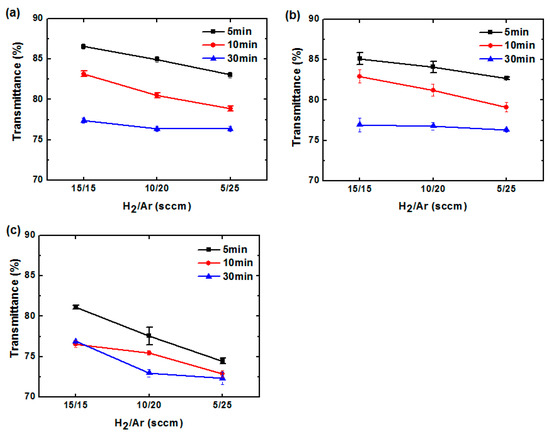 The transmittance spectra of GO sheets treated with different treatment times, H2/Ar ratios, and RF powers were recorded by UV-Vis spectrophotometer (see Supplementary Materials Figure S4). The transmittances at 550-nm wavelength for different treatment times and H2/Ar ratios under RF powers of 200, 300 and 400 W are displayed in Figure 3a–c, respectively. For 200-W RF power and all H2/Ar ratios, the transmittances of the rGO/PET samples exhibit low values with increased treatment time. It has been reported that GO absorption is high in the near-infrared range, and that graphene theoretically absorbs 2.3% of visible light at 550 nm [37,38]. Therefore, it is thought that a greater reduction corresponds to a lower transmittance. In other words, a trade-off must be made between conductivity and transmittance. In this study, the lowest transmittance values were observed for 400-W RF power (Figure 3c). The corresponding sheet resistance values were also the lowest.