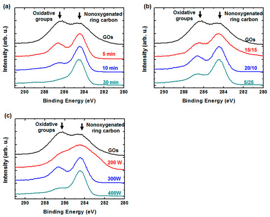 The oxygen bonding in the rGO sheets after the H2/Ar-LDPT process was examined using XPS. Figure 4a–c show the treatment time, H2/Ar ratio, and RF power dependences of the C 1s spectra, respectively. In addition to nonoxygenated ring carbon (C–C) located at 284.5 eV, the XPS C 1s spectra of the GO sheets feature signals at higher chemical shifts for oxidative functional group, including hydroxyl groups (C–OH), carbonyl groups (C=O), and carboxyl groups (COOH) [29,39]. After the H2/Ar-LDPT process, the intensities of the oxidative functional groups located at the higher chemical shifts decreased, indicating GO reduction. It is also apparent that more oxidative functional groups were removed when the treatment time was longer as shown in Figure 4a. Figure 4b,c show the H2/Ar ratio and RF power dependency on the removal of the oxidative functional groups. As the Ar flow rate and RF power increased, more oxidative functional groups were removed, because of the higher Hα intensity. These results are consistent with those for the sheet resistance and Hα intensity, shown in Figure 1 and Figure 2, respectively, indicating that greater removal of the oxidative functional groups corresponds to a higher reduction level, which, in turn, leads to higher conductivity.