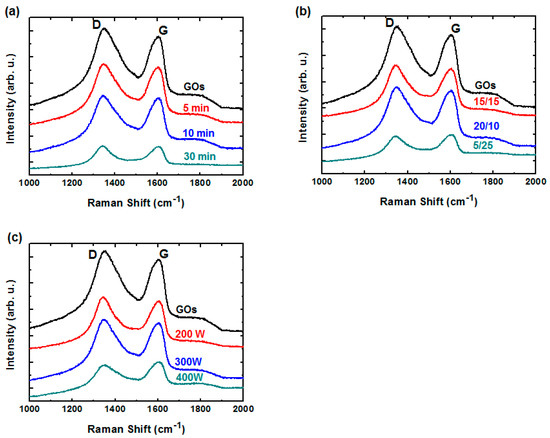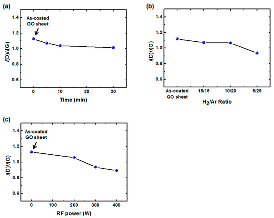 Following the characterization of chemical compositions of GO sheets as a function of various H2/Ar-LDPT process conditions, structural changes to the GO sheets resulting from H2/Ar-LDPT were investigated by Raman spectroscopy. Figure 5a–c displays the Raman spectra of GO sheets treated with different treatment times, H2/Ar ratio, and RF powers. The Raman spectrum of as-coated GO sheet shows a G-band (ca. 1600 cm−1) and D-band (ca. 1350 cm−1) corresponding to ordered sp2 bonded carbon and structural defects created by oxygenated functional groups, respectively [40]. After the H2/Ar-LDPT process, as shown in Figure 5a, the relative intensities of G and D slightly changes as the treatment time increases. The intensity ratio of the D and G bands (I(D)/I(G)) is commonly used as an index for the defect level existing in graphene. As exhibited in Figure 6a, the I(D)/I(G) of as-coated GO sheet is 1.13 and the ratio slightly decreased as the treatment time increased. The I(D)/I(G) is 1.01 for treatment time of 30 min. The dependencies of I(D)/I(G) on H2/Ar ratio and RF power are displayed in Figure 6b,c. As the Ar flow rate and RF power increased, I(D)/I(G) decreased prominently. The lowest values of I(D)/I(G) for Ar flow rate of 25 sccm and RF power of 400 W are 0.94 and 0.89, respectively. Those results indicated that the more the Hα generates in H2/Ar LDPT process, the slightly lower the defect level of rGO sheet is obtained. Moreover, it has been reported that reduction by hydrazine hydrate or hydroiodic acid leads to higher I(D)/I(G) corresponding to the generation of defects [8,9,10]. The decrease in I(D)/I(G) of GO sheets treated by H2/Ar-LDPT indicates that the reduction process slightly repairs the flakes of GO sheets without introducing additional defect due to plasma damage.