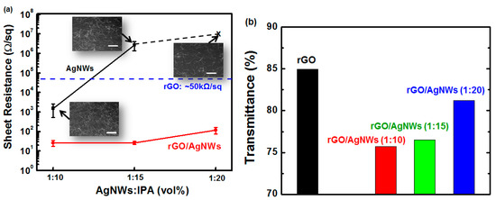 (a) Sheet resistance and (b) transmittance of silver nanowires (AgNWs) and hybrid rGO/AgNWs thin films as functions of AgNW concentration. Insets: SEM images of AgNWs with various solvent concentrations. Scale bar: 1000 μm.