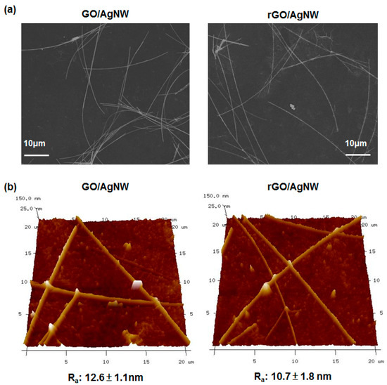 (a) SEM and (b) AFM images of hybrid thin films before (GO/AgNW) and after (rGO/AgNW) H2/Ar-LDPT.