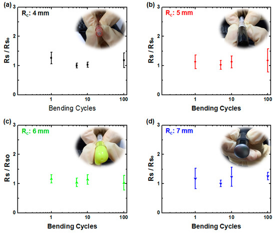 Flexibility test of hybrid rGO/AgNWs thin film (AgNW:isopropanol (IPA) = 1:20) under various radii of curvature (Rc): (a) 4 nm; (b) 5 nm; (c) 6 nm and (d) 7 nm. Insets show the photos of cylindrical objects with various radius R.