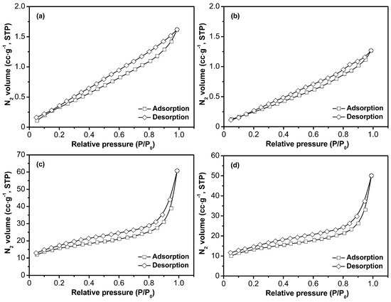 N2 adsorption-desorption isotherms of S-1 (a), S-2 (b), S-3 (c), and S-4 (d).
