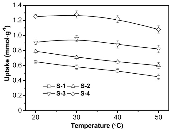 The temperature has two major effects on the adsorption process. Temperature dependence of the adsorption system dictates the adsorption as endothermic or exothermic. Increasing the temperature is recognized to increase the rate of diffusion of the adsorbate, owing to the decrease in the viscosity of the solution [43,44]. In this experiment, the temperature was set at 20–50 °C according to the usual temperature regime in wastewater treatment. As shown in Figure 10, slight increase in the adsorption efficiency was observed for S-3 and S-4 upon increasing the temperature from 20 to 30 °C. Further temperature increases led to minor decreases in the adsorption capacity. The adsorption capacity for S-1 and S-2 decreased all the way from 20 to 60 °C. An increase in temperature may facilitate the transfer of metal ions from aqueous solution into adsorbent, however, higher temperature may also induce a desorption process of metal ions [1].