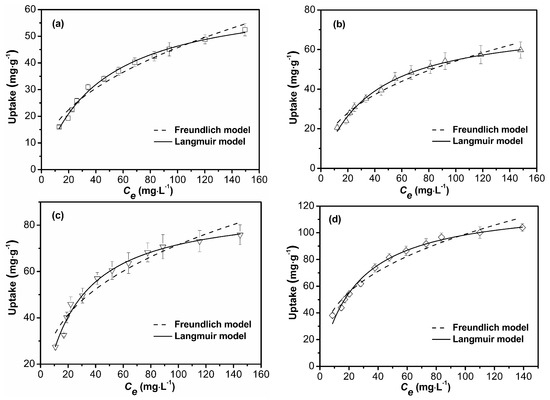 In the adsorption process, the distribution of solute between the solid and liquid phase and measurement of the distribution coefficient can be studied by utilizing various adsorption isotherms [25]. In order to disclose the nature of the interaction between the adsorbent and adsorbate molecules, the Langmuir and Freundlich isotherm models were employed to fit the Cu2+ removal process by four samples as shown in Figure 11 and Table 5.