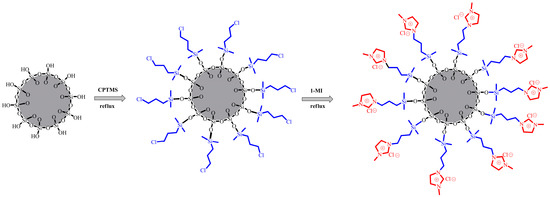 Scheme of supported ionic liquid silica (IL-silica). CPTMS: 3-chloropropyltrimethoxysilane; 1-MI: 1-methylimidazole.