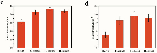 Figure 5 exhibits the mechanical properties of epoxy composites with different IL-silica loading. Compared with u-silica20/epoxy composites, the tensile strength, flexural strength, flexural modulus, and impact strength of IL-silica20/epoxy composites increased from 32.8 MPa, 43.0 MPa, 1.57 GPa, and 7.8 kJ·m−2 to 46.1 MPa, 70.2 MPa, 2.13 GPa, and 16.4 kJ·m−2. The improvement is due to the uniform dispersion of fillers and chemical bonds at the matrix/filler interface via polymerization of epoxy resin with the active imidazole groups of IL-silica. The reinforcement effect of polymer composites largely depends on the efficiency of load transfer at the interface [29,30]. In the present epoxy network, IL-silica served as a linker for epoxy polymer chain. This can efficiently improve the interactions between epoxy matrix and the silica filler. The uniform dispersion of IL-silica and improved interfacial interaction are favorable to enhance the load transfer from epoxy matrix to silica filler, and thus significantly increase the mechanical properties [31,32]. By using 30 phr IL-silica in epoxy composite, tensile strength increased from 46.1 to 52.3 MPa, flexural strength from 70.2 to 84.4 MPa, flexural modulus from 2.13 to 2.32 GPa, and impact strength from 16.4 to 19.2 kJ·m−2. A further increase in IL-silica content (up to 40 phr) generated a slight decrease of mechanical properties. This can be explained by the agglomeration of IL-silica in high content.