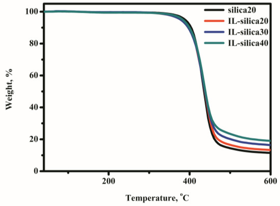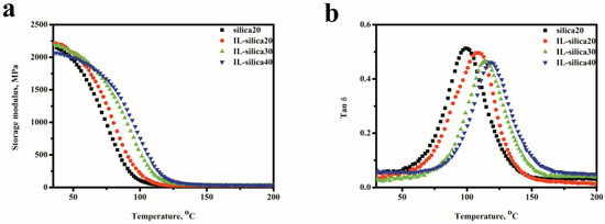 Here the thermomechanical properties of epoxy composites are investigated based on the DMA results. The storage modulus and tan δ of various epoxy composites are shown in Figure 6. The homogeneous dispersion of fillers in polymer matrix and their interfacial interaction will have a significant effect on the thermomechanical properties [33,34]. For epoxy composites containing IL-silica, IL-silica can be used both as curing agent and effective reinforce filler for epoxy composites. Epoxy composite with IL-silica exhibited higher storage modulus in the rubbery region than the composite filled with u-silica. The storage modulus E′ of the epoxy composites in the rubbery region increased by increasing the IL-silica content. This behavior is attributed to the improved interfacial interactions, since the IL-silica can discourage the mobility of epoxy matrix around IL-silica and provide additional stress transfer under loading. In IL-silica/epoxy composites, imidazole groups of IL-silica could react with epoxies and construct the crosslink network through covalent bonds on the interface. This effectively restricts the movement of epoxy polymer chains and promotes energy dissipation from the matrix to filler, resulting in an increase in modulus. Figure 6b shows the temperature dependence of tan δ values of epoxy composites. Clearly, the Tg value of the IL-silica20 sample shifted toward higher temperature by 9.2 °C compared to that of the silica20 sample. The presence of IL-silica led to a higher cross-linking degree of the resultant network than u-silica/epoxy composites. The Tg value of IL-silica/epoxy composites continuously shifted to higher temperature with increasing IL-silica content. This can be attributed to the increase of crosslinks density of epoxy resin with increasing IL-silica content, which would restrict the mobility of the epoxy chains for the enhanced interfacial interactions.