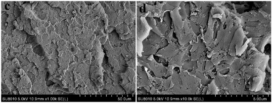 Figure 8 presents the representative morphologies of the fractured surfaces of epoxy composites. From Figure 8a,b, the u-silica is present in the form of agglomerates in the epoxy matrix due to the formation of hydrogen bonds among abundant silanol groups, which partially offsets the reinforcement effect on mechanical properties. In case of IL-silica/epoxy composites, most of the silanol groups have been reacted and the surface has been changed from hydrophilic to hydrophobic, thus the agglomeration tendency would be reduced. As shown in Figure 8c,d, the absence of obvious aggregates on the fractured surface confirms the more uniform dispersion of IL-silica in epoxy resin than u-silica. Clearly, the IL-silica is embedded well into and tightly bound to the epoxy matrix. Additionally, in Figure 8c,d, large and elongated crack patterns confirm higher crack growth resistance of IL-silica/epoxy composite, which facilitates energy dissipation and increases the fracture toughness [38]. These characteristics are consistently associated with the increased interfacial adhesion and efficient transfer of the load in IL-silica/epoxy composites.