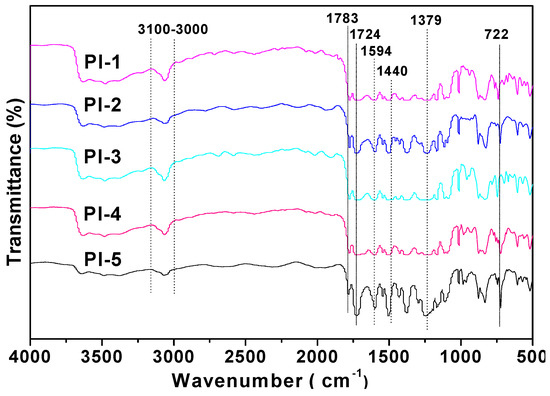 The chemical structures of PIs were characterized by FT-IR spectroscopy, as shown in Figure 2. The FT-IR spectra showed the characteristic absorption at 1783 cm−1 (asymmetrical stretching) and 1724 cm−1 (symmetrical stretching), C–N stretching at 1379 cm−1, and imide ring deformation at 722 cm−1. The characteristic absorptions of pyridine was appeared in 1594 and 1440 cm−1. The stretching absorption of methylene from pyrrolidine were also observed in the range of 3100–3000 cm−1. Obviously, the disappearance of the characteristic absorption peaks of –NH2 group near 3200–3350 cm−1 indicated the complete formation of imide structure.