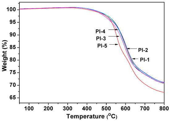 The thermal properties of PIs were evaluated by DSC and TGA at heating rate of 10 °C/min under N2 atmosphere. DSC curves of PIs are shown in Figure 3, and the glass transition temperatures (Tgs) obtained from the second heating curve of DSC are outlined in Table 1. The Tg values of these polymers all exceeded 316 °C, and just as expected, the different values of Tgs are related to the structure of the dianhydride component. In general, Tgs will decrease with an increasing flexibility of the structure of dianhydride. On the contrary, with the increase in rigidity of dianhydride structure, Tgs of polymers will be raised. Obviously, PI-1 showed no Tg in Figure 3, and it may be due to the presence of rigid pyromellitic units in the polymer chain, which limited the free rotation of molecular chain greatly and led to the Tg higher than its decomposition temperature. The Tg values of PI-2–PI-5 were in the range of 316–359 °C. PI-2 presented higher Tg (359 °C) due to the introduction of relatively rigid biphenylic units. However, it was found that PI-3 showed the minimum Tg value (316 °C) than that of other polymers, which might be attributed to the incorporation of flexible ether linkages moieties from ODPA in the polymer backbone.
