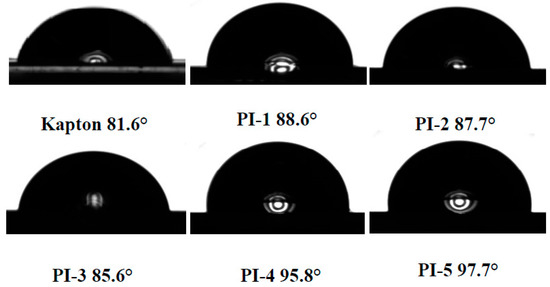 As shown in Figure 5, the hydrophobic property of PI films were evaluated by measuring their contact angles, and the results were listed in Table 1. In general, the higher contact angle of polymer has, the better hydrophobicity of polymer will exhibit. All the polymers, presented excellent hydropobicity with the contact angles in the range of 85.6°–97.7°, and higher than that of commercial Kapton (81.6°) [49,50]. This fact is attributed to the presence of hydrophobic pyridine and bulky pendent groups in the polymer backbones. Furthermore, the presence of heterocyclic units of polyimides, such as pyridine and pyrrolidine rings in the polymer structures, is more resistant to hydrolysis and nucleophilic attack than that of imide rings, that is to say, which improve indirectly the hydrolytic stability of polyimides [2]. Obviously, PI-5 based on 6FDA showed the highest hydrophobic value (97.7°), and that is because the incorporation of fluorine-containing hexafluoroisopropylidene groups in the polymer chain decreased the surface energy of the polymer, and then displayed the best hydrophobicity. However, the contact angle of PI-3 originated from ODPA revealed the lowest hydrophobic value (85.6°), and it may be due to the ether linkage from ODPA forming hydrogen bonds with water.