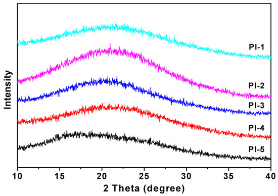 The crystallinities of polymers were investigated by Wide angle X ray diffraction (WAXD) with graphite monochromatized CuKα ration and 2θ ranging from 10° to 40° at room temperature. As shown in Figure 6, the representative X-ray diffractograms indicated that all of the PIs are an amorphous pattern with a wide dispersion peak, and it could be mainly explained by incorporation of bulky pendent groups, flexible linkages, and co-planar structures in the polymer chains, and then led to increasing the spacing between molecular chains, decreasing the intermolecular interactions, and the packing density of the polymer backbone, and resulting in the formation of amorphous structures. Moreover, no melting peak was observed except the Tg in Figure 3, which was also in accordance with the analysis results of WAXD. In addtion, the amorphous nature of PIs also reflected their good solubility in organic solvents.