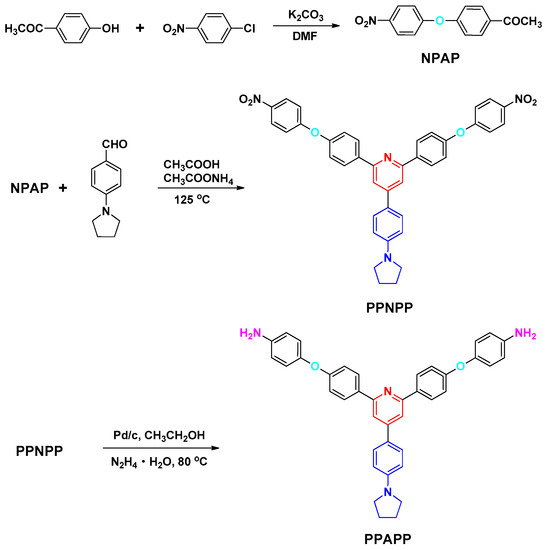 PPAPP was synthesized by a three-step synthetic route, as illustrated in Scheme 1. Firstly, the 4-hydroxyacetophenone reacted with 1-chloro-4-nitrobenzene in DMF to get the intermediate compound NPAP. Secondly, the dinitro compound PPNPP was obtained via modified Chichibabin reaction, which reported the best way to get pyridine rings from NPAP and 4-(1-pyrrolidinyl)benzaldehyde. Finally, the PPAPP was obtained the reduction of PPNPP with hydrazine monohydrate and Pd/C catalyst.
