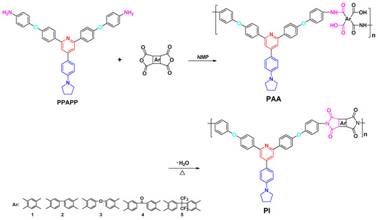 The second step, the PAA obtained above, the PAA precursors obtained above, were then transformed into polyimide by the thermal imidization process. For this method, the PAA solution was poured onto a clean glass substrate, and then placed at 80 °C for 12 h to slowly to release the most casting solvent. The semidry PAA was further dried by programmed heating at 150 °C, 200 °C, 250 °C, and 300 °C, for each 1 h, and then the PI film was peeled off from the glass substrate by immersion in water. Finally, PI-1 (PPAPP–PMDA) film was obtained after drying at 150 °C for 12 h before being measured. The thermal imidization method was also adopted by the above method to obtain other PI films, which named PI-2 (PPAPP–BPDA), PI-3 (PPAPP–ODPA), PI-4 (PPAPP–BTDA), and PI-5 (PPAPP–6FDA).