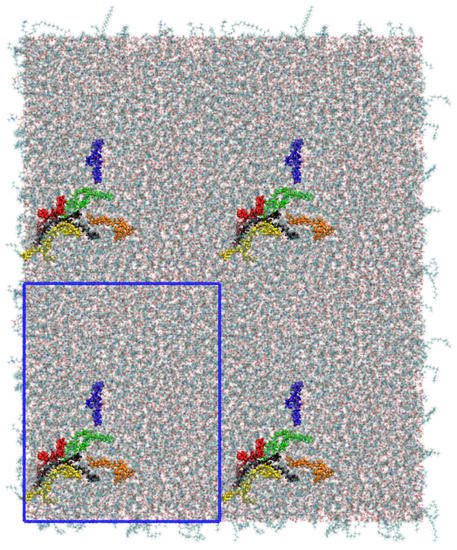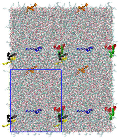 Snapshot of the top view onto the system showing the clustering of the B16/10 molecules. Namely the red, yellow and black colored molecules form a cluster, whereas the green and orange molecules are surrounding the cluster. Compared to Figure 3 (same coloring of the molecules), one can see that the cluster exchanges the molecules within the simulation. The simulation cell dimensions are shown as blue rectangle.