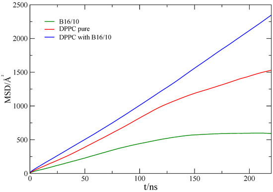 Mean square displacement of lipids in a pure DPPC bilayer (red), the lipids (blue) and B16/10 molecules (green) in the mixed system (lipids/B16/10).