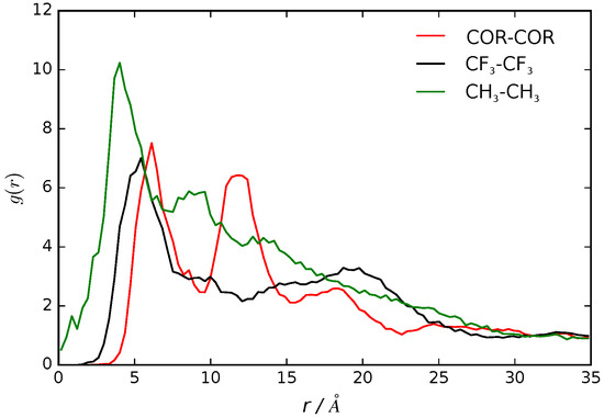 We calculated the pair correlation function, , as the probability of finding a pair of B16/10 molecules at distance r apart, relative to the probability expected for a completely random distribution at the same density [43]. The of the center of mass for each central phenylene ring of a B16/10 molecule (COR-COR) and of its terminal groups (CH3 and CF3) is shown in Figure 5.