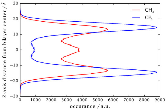In Figure 9 the averaged position distribution of CF3 and CH3 terminal groups of B16/10 molecules relative to the center of mass of the system is shown. For avoiding artifacts, the center of mass movement of the whole system has been subtracted. The center of the lipid bilayer is denoted by and z is the axis along the normal of the bilayer plane. The bilayer itself has a thickness of approximately 40 ± 2.5 Å. As one can see in Figure 9, both side chains approach the head group region of the bilayer. Nevertheless the CF side chain tends to stay more in the headgroup region than the CH chain. The combination of higher solubility inside the leaflets (which was recently shown by Brehm et al. [3]) and sterical issues force the CF3 terminal group to stay in the headgroup region as in direct comparison the CF side chain is nearly inflexible whereas the CH side is more flexible and thinner which makes it easier for the CH chain to find its way through the lipid bilayer. Not surprising is, that the CH3 terminal group has a high occurrence in the middle of the bilayer, as this the most non polar region of the bilayer which has been observed in experiment before for alkanes [2]. Of course sterical issues are more dominant because not every polyphile can arrange like this when incorporated into a cluster and therefore it also stays frequently inside the leaflets. On first sight the occurrence of the CF3 terminal group in the middle of the bilayer seems astonishing. It is easy explained by attempts to flip the sides of the bilayer. As it is only ninth of the occurrence of the highest peak this rarely happens and is never a stationary state. By closer inspection we found that the flipping of the CF side chain happens on a nanosecond time scale.