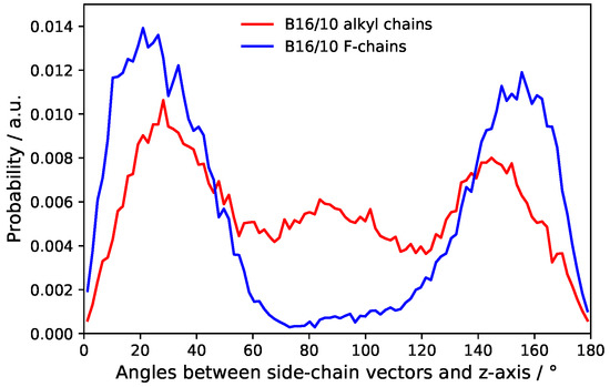 The calculated angular distributions of the B16/10 backbone are in very good agreement with our former results of a single B16/10 molecule inside a DPPC bilayer [35]. The B16/10 molecules are well incorporated into the lipid bilayer, cross the whole bilayer with their well-matched hydrophobic core length and adapting into the bilayer by a slight tilt.