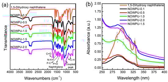 In the FTIR spectra (Figure 1a), the absorption of C=O at 1694 cm−1 and that of N–H at 1533 cm−1 came from the main polyurethane chain. The absorptions of P–C and P=O derived from OP550 unit was at 1459 cm−1 and 1238 cm−1, respectively. The coupled absorption of , C–N, C–O, and N–CO–O at 1120 cm−1 was due to add hydrophilic curing agent. Additionally, the absorption of naphthalene at 1459 cm−1 (with P–C overlapping) and the absorptions of C–H at 865 cm−1 and 779 cm−1 were according to 1,5-dihydroxy naphthalene. When compared with the spectrum of 1,5-dihydroxy naphthalene, the spectra of the NOWPUs showed a bathochromic shift in the absorption maxima from 297 to 305 nm (Figure 1b).