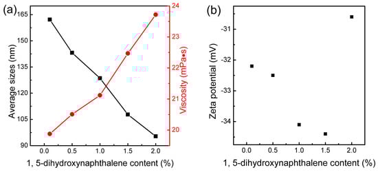 The average grain sizes of the NOWPUs increased from 96.7 to 165.0 nm upon the addition of 1,5-dihydroxy naphthalene (Figure 2a). Meanwhile, the viscosity decreased from 23.6 to 19.8 mPa·s (Figure 2a) as the 1,5-dihydroxy naphthalene content increased. The zeta potential values for the NOWPUs were all lower than −30 mV (Figure 2b).