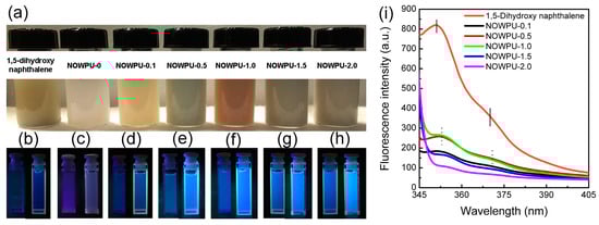 Figure 3a–h show photographs of the 1,5-dihydroxy naphthalene and the NOWPUs in water under room light and UV light, respectively. The NOWPUs displayed a fairly strong fluorescence emission (Figure 3i), which had a weak bathochromic shift of approximately 4 nm (from 351 to 355 nm) in the emission maximum.
