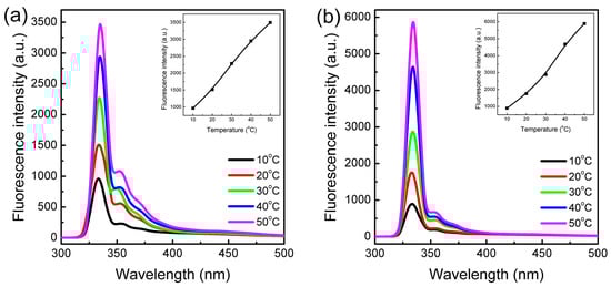 Fluorescence spectrum of (a) NOWPU-0.5 and (b) NOWPU-1.0 with various temperatures (concentration of NOWPUs = 10−3 g/mL in water, λex of NOWPU-0.5 = 331 nm, λex of NOWPU-1.0 = 332 nm).