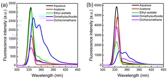Fluorescence spectrum of (a) NOWPU-0.5 and (b) NOWPU-1.0 with various solvents (Concentration of NOWPUs = 10−3 g/mL in water, λex of NOWPU-0.5 = 331 nm, λex of NOWPU-1.0 = 332 nm).