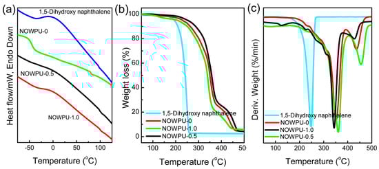 (a) DSC (differential scanning calorimetry) curves; (b) TGA (thermogravimetric analysis) curves and (c) DTG (differential thermal gravity) curves of NOWPU films.