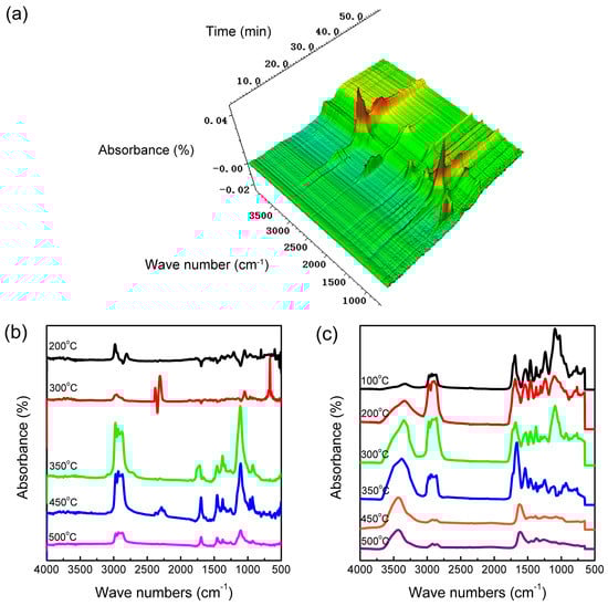 NOWPU-1.0 was used to analyze the TGA-FTIR and FTIR spectra of the films at various decomposition temperatures (Figure 7). Figure 7a is a 3D image from the TGA-FTIR tests, and Figure 7b is the FTIR spectrum obtained from the TGA-FTIR (Figure 7a). Figure 7b shows the very weak characteristic absorption peaks of CO2, –NCO, and HCN at 2379, 2357, and 2315 cm−1, respectively, at 200 °C. At 300 °C, the absorptions of P–OH and SO2 were observed at 1708 and 1046 cm−1, respectively. Meanwhile, the stretching vibrations of the C–H in the benzene ring were at 668 and 650 cm−1 in the fingerprint region. Furthermore, NH3 (925 cm−1) was present at this stage. As the temperature continued to increase, the absorption peaks of C=O, –CHO, and the ester bond were at 1718, 2720, and 1111 cm−1, respectively. Meanwhile, NH3 (925 cm−1) was also created at this stage. The absorption peaks of methyl or methylene groups and ether bonds were still occurring. At 450 °C, the absorption peak of the ether bond at 1105 cm−1 and the characteristic absorption peak of C=O at 1696 cm−1 increased in intensity. NH3 was still present at 929 cm−1.