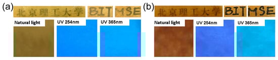The pencil hardness of the NOWPU films increased after adding the rigid 1,5-dihydroxy naphthalene, which provided large backbone groups for the macromolecule chains to increase the rotational steric hindrance and improve the rigidity of the macromolecule chains to improve the pencil hardness. All of the films passed the solvent resistance testing with the addition of a rigid organic compound, because the intramolecular and intermolecular hydrogen bonds were enhanced and provided a strong interface interactions and binding forces to tighten the network structures [27]. Consequently, the crosslinking network structure acted as a barrier to reduce the intrusion points during the solvent intrusion into the interior through the coatings. The NOWPU-1.0 had a high transmittance for natural and visible lights, 100.0% and 95.5%, respectively, because the light scattering was caused by the phase separation [27]. NOWPU-1.0 had the most obvious phase separation according to the DSC results. Besides, NOWPU-1.0 had an extremely low transmittance of UV light at 200 nm, and the film could be used in specific areas for functional textiles that need to shield UV light and have a high gloss. NOWPU-1.0 had a wider color range for the different UV radiations, and the word below the NOWPU-1.0 coating film was more distinct than that below the NOWPU-0.5 film, except for the darker film color, which could introduce an application of fluorescent coatings.