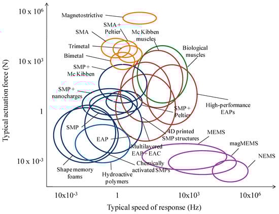 Usual actuation force vs. speed of response for actuators based on “smart” materials. Abbreviations: EAC, electroactive (normally piezoelectric) ceramics; EAP, electroactive polymers; SMP, shape-memory polymers; SMA, shape-memory alloys; MEMS, microelectromechanical systems; magMEMS, Magnetic microelectromechanical systems; NEMS, nanoelectromechanical systems. Adapted and updated from study by our team [23].