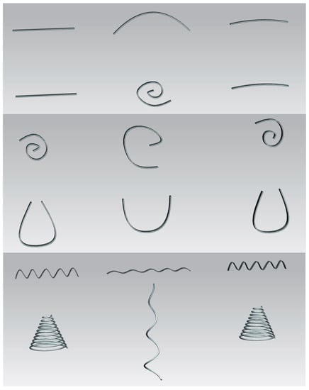 In many cases, the geometrical changes of a shape-memory polymer based “smart” actuator are quite simple, as schematically shown in some of the examples of Figure 2. Bending, stretching or twisting a shape-memory stripe can be usually performed with very simple equipment or mechanical testing units. The use of thermally controlled mechanical testing machines, not just for characterizing the shape-memory polymer, but also for obtaining the temporary shape, has been previously highlighted [8].