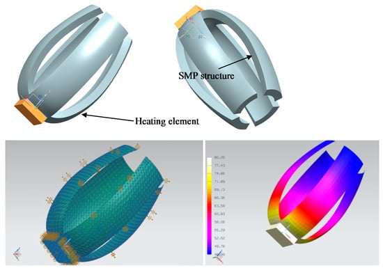 In any case, advanced multi-physics simulation resources, including the FEM (finite-element modeling) thermo-mechanical simulation modules available in different state-of-the-art computer-aided design and engineering programs, prove to be very useful for an adequate design of the activation system of SMP-based devices. Figure 3 includes an example of a heating system for SMP activation designed using thermal FEM simulations. Prototype testing with the help of infrared thermography constitutes an excellent validation procedure for adjusting the simulations for further design activities, as further discussed in Section 2.4.