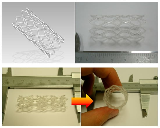 Computer-aided design of the complex geometry of a SMP-based stent, rapid prototype, compressed temporary shape and shape recovery by heating. Adapted from author’s Thesis [10].