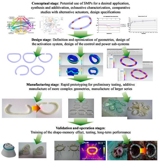 Summary of the complete development process, supported by computer-aided engineering and additive manufacturing approaches, for a “smart” annuloplasty ring based on shape-memory polymers oriented to the potential treatment of mitral valve insufficiency. Adapted from author’s Ph.D. Thesis [10].