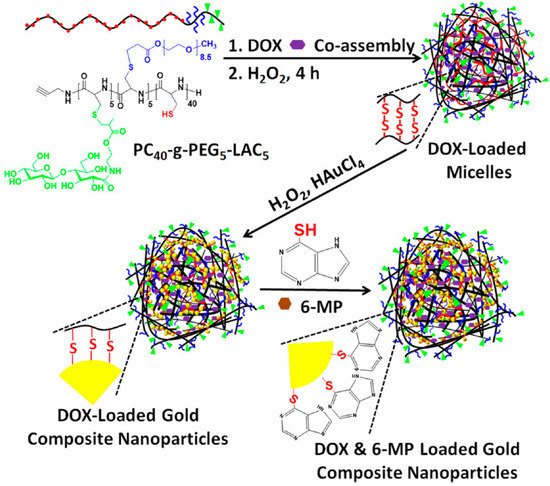 Assembly of doxorubicin (DOX) and 6-mercaptopurine (6-MP) dually loaded polypeptide/gold composite nanoparticles. Source: Wu et al. 2016 [58]. Reproduced with permission of American Chemical Society.