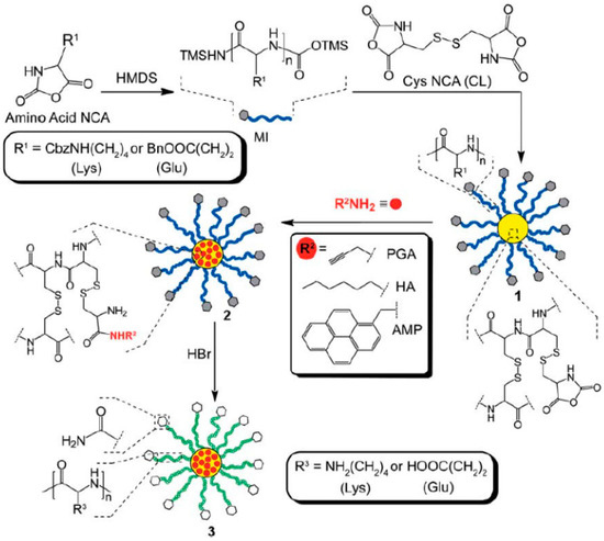 Qiao et al. prepared star polymers by exploiting the cross-linking capacity of p(l-Cys—which served as the core of the star polymer and another PAA—p(l-Glu) or p(l-Lys) formed the arms, Scheme 5 [59]. The star polymers were produced in a one-pot synthesis, where the ‘arms’ of the star were polymerized first by the ROP of l-Lys or l-Glu NCA. These authors used a secondary amine, hexamethyldisilazane, as initiator, which they found to provide better control over the polydispersity than the typically used amino initiators. Once the linear arms were formed the NCA of the cystine dimer was added, that is, two NCA functionalities per monomer, and polymerized. This polymerization yielded a cross-linked structure due to the bifunctionalilty of the cystine monomer. Star formation depended largely on an optimum cross-linker (cysteine) to macroinitiator (‘arm’ of the star) ratio, which by itself heavily depended on the molecular weight of the macroinitiator [60]. Since not all NCA units on the cystine monomer participate in the ROP, the core of the star polymer can be subsequently derivatized by opening these unreacted NCA groups with amines. Deprotecting the ‘arms’ of the star polymer yielded a p(l-Lys) or p(l-Glu) corona for the star polymers, thereby making the construct water soluble. Equally, the ‘arms’ of the star polymers can be derivatized after deprotection. For example, p(l-Glu) was directly converted into a hydrazide derivative by conversion with hydrazine, thereby providing a route for drug conjugation.