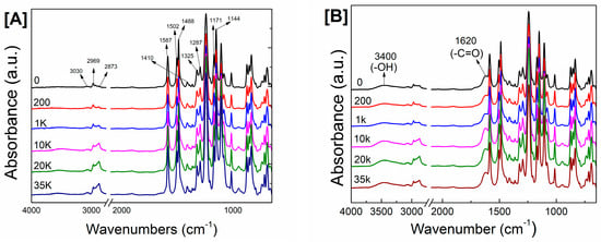ATR-FTIR spectra of: (A) PSf membranes; and (B) TFC membranes with varying PEG molecular weights.