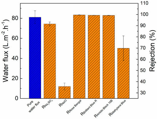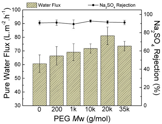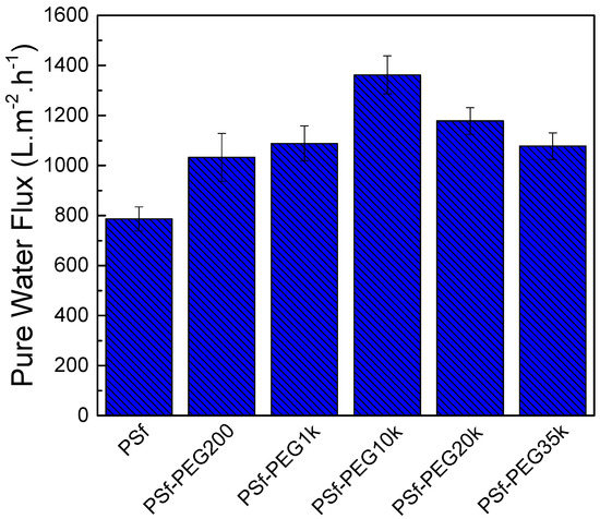 A cross-flow filtration at 0.10 MPa and at 0.6 was performed at room temperature. The flow rate was controlled between 0.60 and 0.70 L·min−1. As indicated in Figure 4, the optimum water permeability (1361.9 L·m−2·h−1·bar−1) was attained at PEG10k. A MW higher than 10,000 g/mol resulted in lower water permeability because of the thicker skin layer (Figure 3). Despite the increase in the membrane thickness, the PEG-modified PSf still exhibited higher water permeability than the pristine PSf because of the enhanced hydrophilicity.