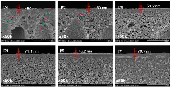 Figure 6 shows the cross-sectional images of TFC membranes prepared using different PEG MW. Increasing the PEG MW (0–35,000 g/mol) led to thicker polyamide layers (70.0–76.7 nm). These results correspond with the membrane support surface pore size. As reported in a previous study [49], small pores in the membrane support surface may hinder the penetration of polyamide in the pores. Therefore, the polyamide layer was formed mainly on the membrane surface.