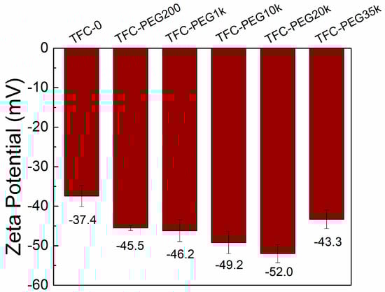 Figure 7 compares the zeta potential of TFC membranes prepared using PEG of different MW at pH = 7. As expected, the TFC membranes had negatively charged surfaces. The zeta potential decreased from −37.4 to −52.0 mV when the PEG MW was increased from 0 to 20,000 g/mol, indicating the presence of more hydrophilic carboxyl groups from the hydrolysis of TMC and from the ABA additive. When the PEG MW was 35,000 g/mol, the zeta potential increased to −43.3 mV. Increasing the MW of PEG from 0 to 20,000 g/mol resulted in a less porous membrane support. As such, the adsorption of amines was less, leading to a weak cross-linking in the polyamide layer. However, increasing the PEG MW to 35,000 g/mol did not affect the membrane support porosity but decreased the water contact angle; thus, the support adsorbed more amines and induced a highly cross-linked polyamide layer.