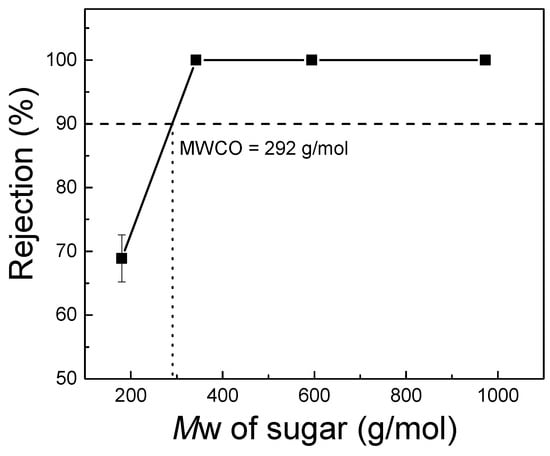 Figure 9 depicts the determination of the TFC–PEG20k molecular weight cutoff. The rejection of sucrose, raffinose, and α-cyclodextrin was 100%, whereas that of glucose was only 69% ± 11.0%. At 90% rejection, the molecular weight cutoff was 292 g/mol. Therefore, this result shows that the membrane molecular weight cutoff was validated to be in the range for nanofiltration.