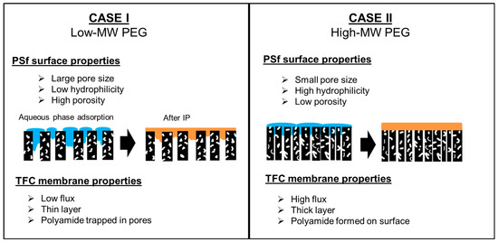 The type of PEG-doped PSf supports would depend on the PEG MW. Figure 11 demonstrates two cases of polyamide formation on different types of PSf support. In Case I, the support was highly porous but had low hydrophilicity. Although the hydrophilicity was low, water penetrated because of the large pores. Consequently, during IP, some polyamide formed in the pores despite the extreme thinness of the polyamide layer. This condition caused high water resistance. For Case II, the PSf support had high hydrophilicity, and its pore size and surface porosity were small. During IP, the formation of a defect-free polyamide layer was mainly on the surface. In other words, no polyamide formed in the pores. Therefore, the flux in Case II was higher than that in Case I because the polyamide did not block the pores.