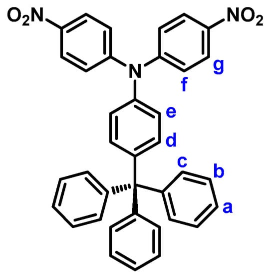 4,4′-Dinitro-4′′-trityltriphenylamine (2). Into a 250-mL round-bottom flask equipped with a stirring bar were charged with 6.71 g (20 mmol) of 4-tritylaniline (1), 6.77 g (48 mmol) of p-fluoronitrobenzene, 7.29 g of cesium fluoride (CsF), and 50 mL of dimethyl sulfoxide (DMSO). The mixture was heated at 140 °C for about 48 h. After cooling, the mixture was poured into 300 mL of methanol, and the precipitated product was collected by filtration and dried to give 8.66 g (75% yield) of the desired dinitro compound 2 as yellow crystals; m.p. = 289−290 °C, measured by DSC at 10 °C min−1. IR (KBr): 1584, 1338 cm−1 (–NO2 stretch). 1H NMR (600 MHz, CDCl3, δ, ppm) (for the peak assignments, see Figure 2): 7.18–7.25 (m, 17H, Ha + Hc + Hd + He + Hf), 7.33 (t, J = 7.7 Hz, 6H, Hb), 8.20 (d, J = 9.2 Hz, 4H, Hg). ESI-MS: calcd. for (C37H27N3O4)+: m/z 577.2002; found: m/z 578.2076 [M + H]+. Anal. calcd. for C37H27N3O4 (577.64): C, 76.93%; H, 4.71%; N, 7.27%. Found: C, 76.04%; H, 4.80%; N, 7.56%.