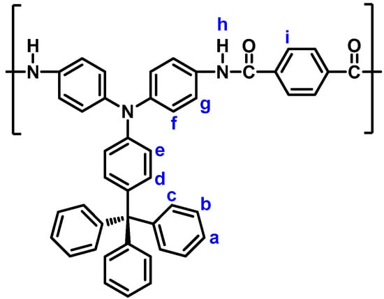The phosphorylation polyamidation technique was used to prepare the polyamides. As a representative example, the synthetic procedure of polyamide (PA) 5a is described as follows. A solution of diamine monomer 3 (0.5176 g; 1 mmol), of terephthalic acid (4a) (0.1661 g; 1 mmol), dried calcium chloride (0.1 g), and TPP (1.0 mL) in pyridine (0.3 mL) and NMP (1.0 mL) was heated at 120 °C for 3 h. A pale yellow fibrous precipitate was obtained when pouring the polymer solution into methanol. The yield of PA 5a is almost quantitative. The inherent viscosity of PA 5a was 0.49 dL/g, in DMAc on 0.5 g dL−1 at 30 °C. IR (film): 3300 cm−1 (N−H stretch), 1660 cm−1 (C=O stretch). 1H NMR (600 MHz, DMSO-d6, δ, ppm) (Figure 4): 6.88 (d, 2H, He), 7.03 (d, 2H, Hd), 7.06 (d, 4H, Hf), 7.17−7.20 (m, 9H, Ha + Hc), 7.30 (t, 6H, Hb), 7.76 (d, 4H, Hg), 8.07 (s, 4H, Hi), 10.37 (d, 2H, Hh).