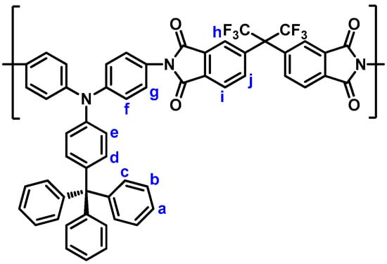 The structures of these polyimides were confirmed by IR and NMR analysis. Figure S6 (Supplementary Materials) shows the IR spectra of PIs 7a−7c. Characteristic absorptions at 1780 and 1717 cm−1 peculiar to imide groups could be observed in these spectra. Representative 1H NMR spectra of polyimide 7b are presented in Figure S7. The resonance signals of the aromatic protons appear in the range of δ 6.9−8.0 ppm. The spectrum agrees well with the repeating unit of PI 7b.