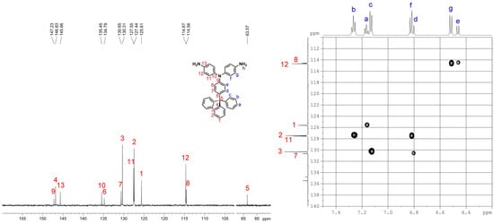 13C NMR and C-H HMQC spectra of 4,4′-diamino-4′′-trityltriphenylamine (3) in DMSO-d6.